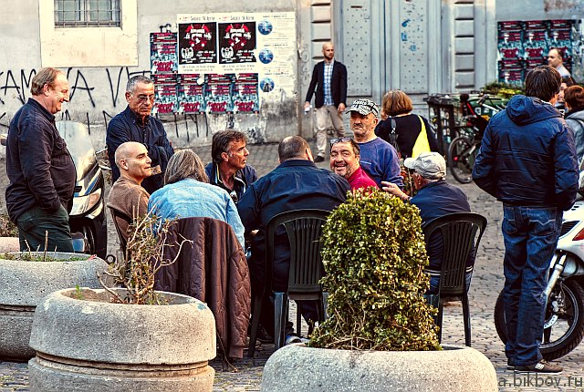 Ситуативное использование городских пространств для отдыха – характерная черта Рима. В городе множество зеленых зон различной геометрии: обширные публичные парки – бывшие аристократические виллы, городские скверы неравной степени благоустроенности, лавочки под деревьями. Способы их освоения разнообразны, но регулярны и опривычены. Это городские институты, такие же как общественный транспорт, фонтанчики с питьевой водой или канализация. Более выраженный оттенок карнавальности Риму придает спонтанный захват для отдыха складок и гладкостей городского пейзажа: парапетов, лестниц, площадей, бордюров фонтанов, цветочных и декоративных тумб, чужих мотоциклов и капотов машин. В основном люди располагаются здесь сидя или облокотившись. Это тоже институт, эфемерный и постоянно запускаемый заново в самых разных точках города обитателями и туристами. Усталость от прогулки, радостное общение, разморенность солнцем, обыденность дружеских встреч, неторопливость досуга выставляются на всеобщее обозрение.