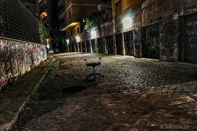 Поворот сцены или инверсия вписанного в нее взгляда – не сразу заметный, но ключевой момент римской уличной жизни. Наблюдаемый с легкостью превращается в наблюдателя и наоборот, а минималистская предметная оснастка этого обращения дробит городской монолит, придавая множеству его островков эфемерную завершенность. Задний двор дома, который в лучшем случае используется для парковки и мимолетных молодежных тусовок, не завален мусором, хотя отчетливо зашумлен визуально. Стены перенасыщены граффити, и те, кто способен верно понять их смысл, столь же искушены, сколь малочисленны. Офисное кресло, помещенное в центр вязкой паутины знаков, перестраивает всю сцену. Из проходного места с небрежными декорациями и случайными взглядами задний двор превращается в центральный наблюдательный пост, точку схождения всех визуальных перспектив. Конечно, остается вопрос, кто наблюдает и что ему интересно.
