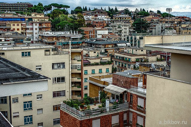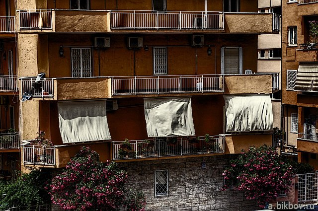 Телесный комфорт, оборудование пространств неги – отчетливая доминанта в эфемерном слое архитектуры, который перемещает тела с нагретой солнцем поверхности в глубокую тень, с камня под ткань, от охры к зелени. Этой задаче служат жалюзи и ставни, без которых не обходится ни одно окно в Риме; тенты, козырьки, навесы, отмечающие места возможной остановки в передвижениях; деревья, в том числе в и на зданиях, а не только под окнами; и, конечно, кондиционеры, которые широко используются в квартирах, приемных учреждений, кафе, больницах, супермаркетах, личных автомобилях, городских электричках, метро и автобусах. Рим – это непрерывное смешение раскаленных и охлажденных потоков воздуха. На снимке – не вывешенные для просушки простыни, а балконные тенты под порывами сильного ветра. Телесный комфорт в Риме тесно привязан к густой тени, этому приоритету дневной жизни. И здесь эстетическое – идеальное выражение для утилитарного – достигает своей высшей моральной формы. В Риме и, кажется, во всей Италии, человеческое достоинство ассоциируется не с трудом, не с политическим выбором, не со свободой слова и совести (хотя все это, безусловно, важно для горожан и граждан), а с комфортным досугом. Жить достойно в Риме означает прежде всего не поступаться комфортом. И этот принцип в значительной мере определяет как архитектурную формулу города, так и ее спонтанное освоение.