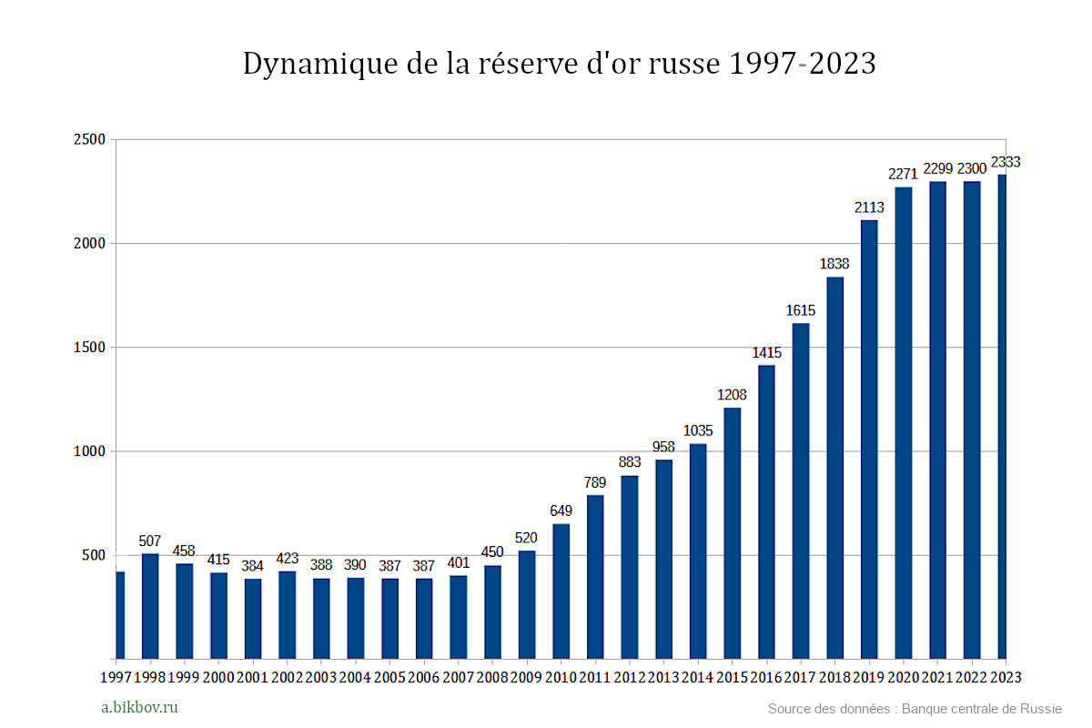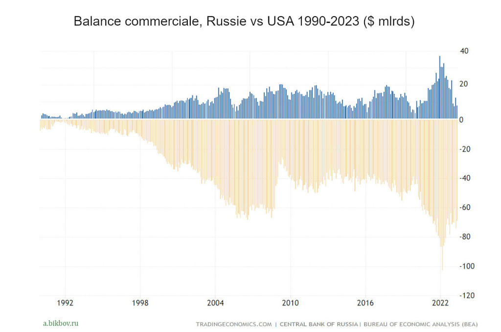 La balance commerciale excédentaire, une préoccupation mercantiliste majeure, est une caractéristique de l’économie russe visible déjà dans les années 1990 et qui s’accentue dans les années 2000 et ensuite (le graphique ci-dessous, en teinte bleue). En 2022, l’année de l’invasion de l’Ukraine, la balance est la plus élevée en valeur absolue, malgré les sanctions internationales. La guerre se fait voir donc comme une manifestation mercantiliste par excellence, ce qui correspond au phénomène historique des guerres coloniales en Europe Occidentale, à l’époque mercantiliste. Le modèle de l’autonomie économique appuyée sur la balance commerciale excédentaire n’est pas le seul possible. Il s’oppose au modèle des États-Unis dont l’économie se repose sur la balance commerciale déficitaire, dans les mêmes décennies (voir le même graphique, en teinte jaune). Cela ne prive pas l’économie américaine de son autonomie, mais reflète sa position dominante dans le système de libre-échange. À cet égard, les stratégies économiques russe et américaine sont diamétralement opposées. Il convient juste de se rappeler que la réserve d’or américaine est la première au monde parmi les états nationaux et est 3,5 fois plus grande que celle russe.