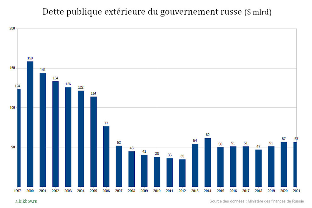 Enfin, la dette extérieure réduite est un autre facteur et moyen de rendre l’économie nationale plus autonome. Ici, le gouvernement russe se trouve encore une fois dans une logique de souveraineté financière. Un grand enjeu des années 2000, payer l’intégralité de la dette extérieure soviétique, a été achevé vers le milieu de la décennie. Depuis lors, cet indicateur se situe à des valeurs nettement inférieures (le graphique ci-dessous). Les dépenses budgétaires dues à l’annexion de la Crimée ont été compensées par une redistribution interne, notamment par le gel d’une partie de l’épargne retraite de la population. Cela a contribué à la hausse des inégalités sociales en Russie, augmentées encore plus par les effets de l’invasion en 2022.