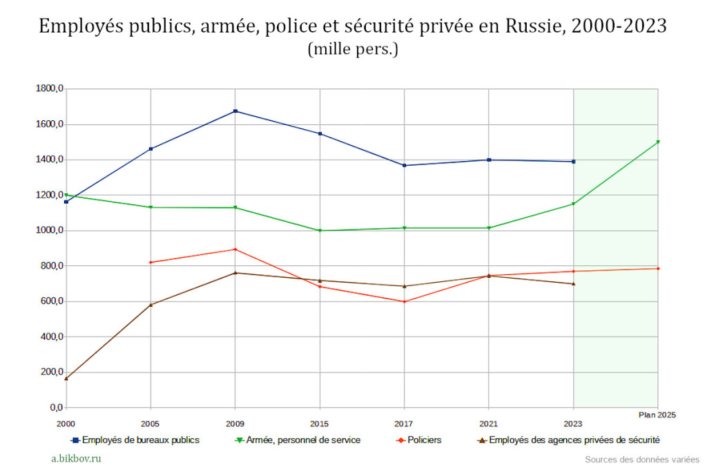 De manière encore plus prononcée, la superposition d’une tendance néolibérale (performance à tout prix) et celle néomercantiliste (l’assurance des fonctions régaliennes de l’État) s’observe dans la gestion de l’appareil d’État. Les réformes néolibérales réalisées au nom de la productivité et de la réduction des dépenses peu rentables rétrécissent les effectifs des employés de bureaux publics (la ligne bleue du graphique ci-dessous), de l’armée (la ligne verte) et de la police (la ligne rouge), dans les années 2010. A l’inverse des stéréotypes, les gouvernements de Poutine et de Medvedev veulent plutôt épargner sur le coût du corps bureaucratique, la police comprise. A partir de 2017 on observe une contre-tendance qui touche l’appareil de la violence, à la différence du service public généralisé qui suit toujours une stagnation des effectifs. L’oppression intensifiée des opposants et, clairement, l’invasion massive de l’Ukraine regonflent le corps armé auparavant censé de se soumettre à la discipline de la performance professionnelle. Le plan pour 2025 reflète le raffermissement de cette dérive régalienne.