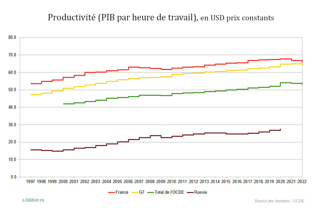 Les réformes néolibérales des années 2000 et en partie de 2010, la réduction du corps bureaucratique, la stimulation de la concurrence, parfois très brutale, dans le secteur culturel et universitaire, ont-elles eu un effet désiré sur l’économie russe ? Visiblement, pas autant, si jamais. L’indicateur de la productivité, au nom de laquelle ces réformes ont été mises en œuvre, en témoigne très clairement. Jusqu’à la fin des années 2000, et notamment avant la crise financière globale de 2008, la productivité augmentait plus rapidement (la Russie est représentée par la ligne brune du graphique ci-dessous). Pourtant la décennie suivante voit une augmentation beaucoup moins rapide, malgré l’accumulation importante des ressources économiques entre les mains du gouvernement russe. Dans les pays de l’OCDE en moyen (la ligne verte), la France incluse (la ligne rouge), la montée en productivité est plus prononcée, dans la même période.