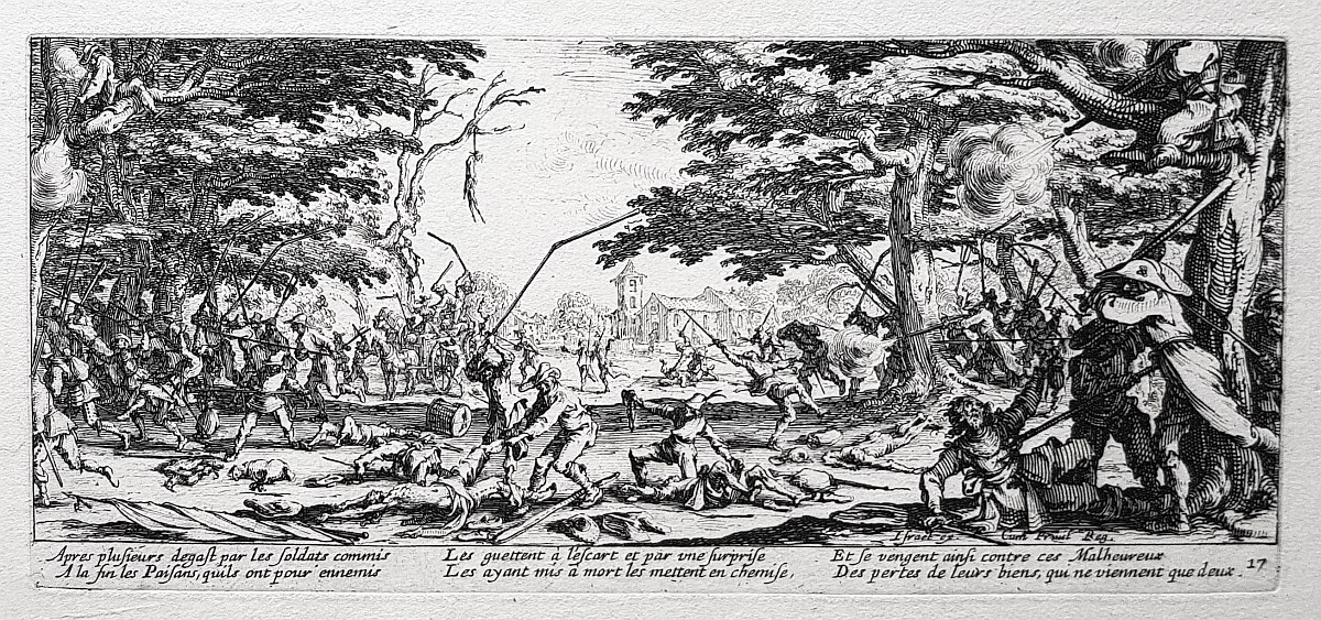 Гравюры цикла стягивают в композиционный фокус исследовательское внимание художника-антрополога к человеческим действиям и взаимодействиям, моральный шок от увиденного и восхитительный микроконтраст света и теней, переданный стилистически изысканным штрихом. Такое сочетание приподнимает изображения над хроникой событий, превращая военные будни XVII века в схему любой войны и урок всех войн.