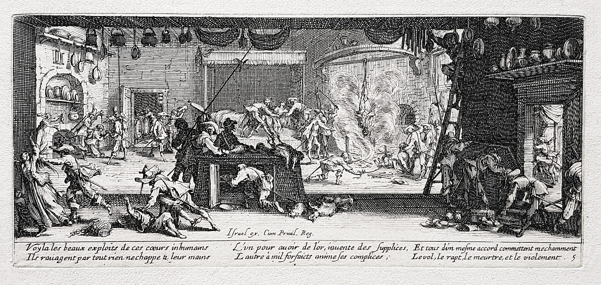 Другая гравюра впечатляет не меньше, чем “Повешение”. Это “Разграбление фермы”. В глубине сцены – фермер, подвешенный вниз головой в клубах дыма, над раздутым огнем камина. Одежда разодрана вместе с кожей, глаза уже мертвы. Его коптят, словно аппетитный окорок, и эта очевидная аналогия делает сцену еще более жуткой. Пытка здесь одновременно инструментальна (узнать, где жертва хранила сбережения) и демонстративно сладострастна – причинить боль ради собственного удовольствия, выставив напоказ. Ужасающая фигура в глубине, как и перегруженное сценами насилия этюдное пространство, напоминают об участи мирных жителей в текущих войнах: не случайной “сопутствующей” жертвы, но жертвы, заранее принесенной аппетиту завоевателей. Вопрос лишь в том, кто окажется в этой роли.
