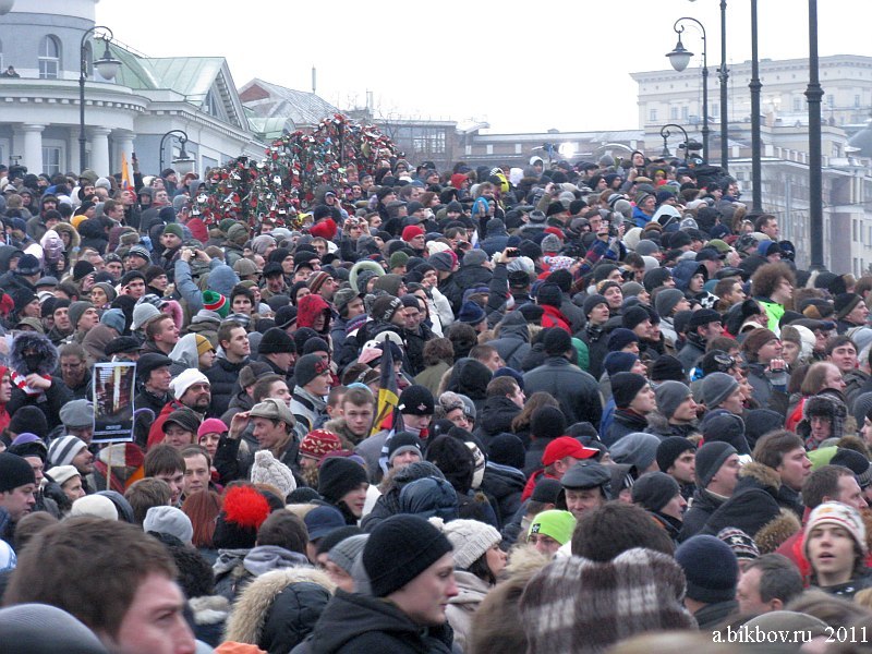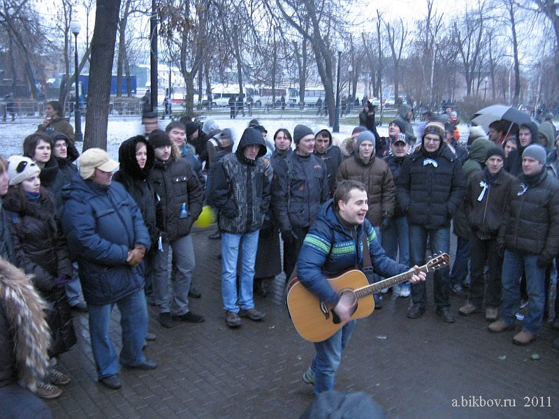 Dans l’espace de la manif, sur place, parmi les participants les plus actifs (avec leurs propres pancartes, souvent très originales et pleines d’esprit, gestes et actions), j’ai observé pas mal de gens qui possédaient visiblement une expérience des activités auto-gérées et partagées avec les autres : le noyau dur des forums sur Internet, les fans des chanteurs de rock importants (comme Chevtchouk et Kintchev), jeunes free-lancers (journalistes, artistes, designers, juristes, rédacteurs, spécialistes en IT et en PR), végétariens, rasta, étudiants appartenant à des groupes amicaux et thématiques (y compris des groupes d’étudiants de ma fac portant des pancartes), supporteurs de foot au-delà des firms combatifs et fortement hiérarchisés, membres des cercles amateurs, aspirants musiciens rock et hard, entrepreneurs. Tous ceux, bien évidemment, aux côtés des militants de l’extrême gauche, de l’extrême droite, des libertariens et des représentants des partis qui ont ” perdu ” suite à la fraude électorale.