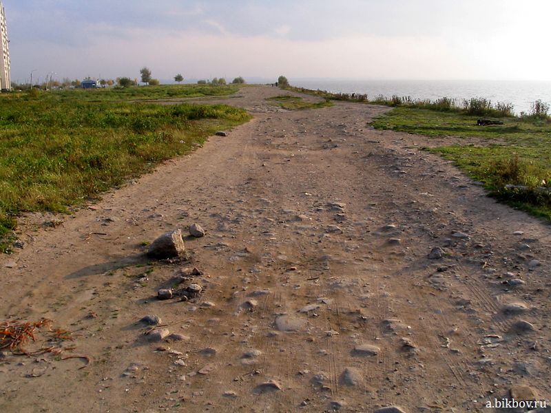 Дорога разливается по берегу Финского залива так, что один из ее рукавов сливается с кромкой моря. На фотографии вода не видна, а скорее угадывается справа вдалеке, в металлическим оттенке. Это отраженное сияние важно лишь как часть общего разнообразия, окружающего дорогу и контрастирующего с ней своей полустертостью и серийностью. Дорога, между тем и в противовес нашим привычкам, обладает почти разящей индивидуальностью.
